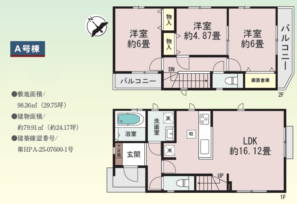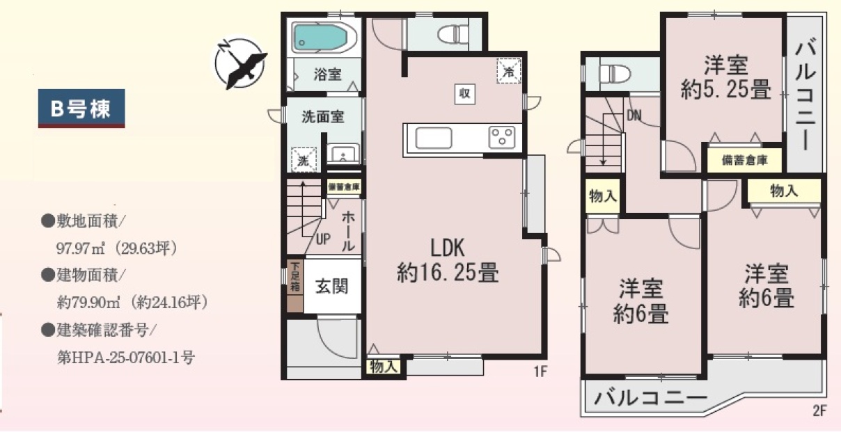 | 販売棟数 | 全2棟 今回販売2棟 | 土地面積 | 97.97㎡〜98.36㎡ |