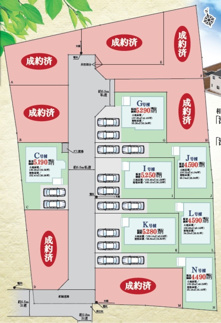 | 販売棟数 | 全14棟 今回販売7棟 | 土地面積 | 130.20㎡〜137.30㎡ |