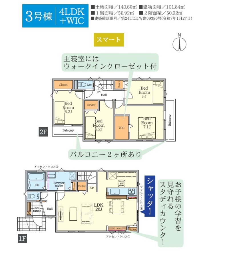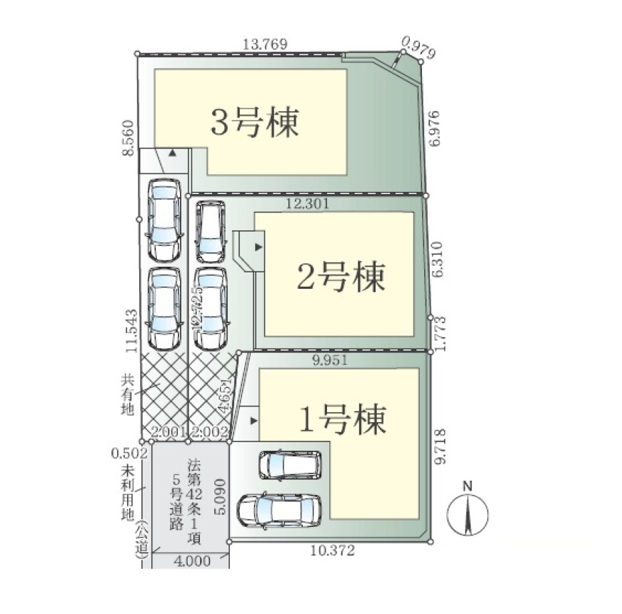 | 販売棟数 | 全3棟 今回販売3棟 | 土地面積 | 100.03㎡〜140.60㎡ |